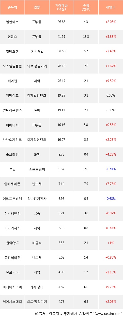 엘앤에프, 인탑스, 알테오젠 등은 전일 대비 주가가 상승했고, 루닛, 에코프로비엠 등은 주가가 하락했다.