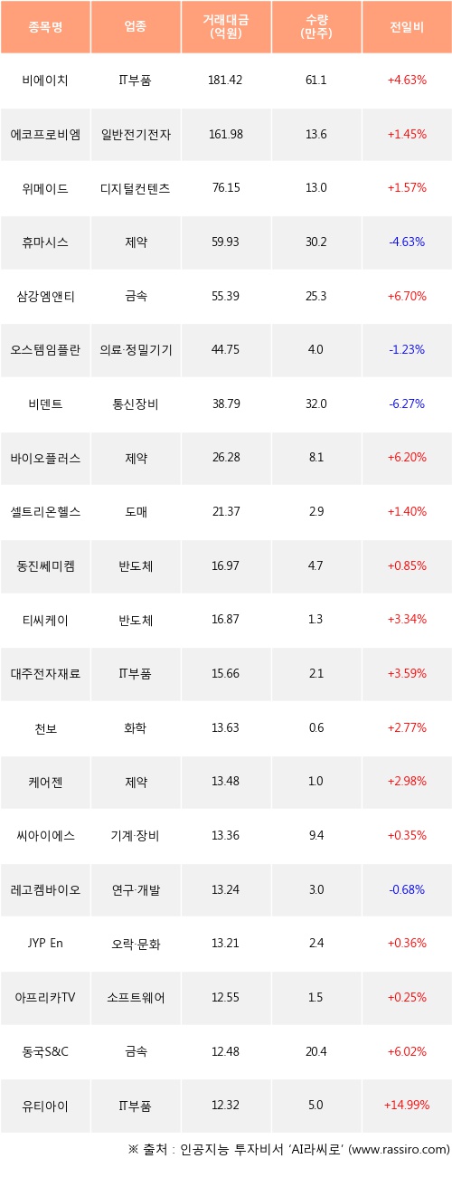 비에이치, 에코프로비엠, 위메이드 등은 전일 대비 주가가 상승했고, 휴마시스, 오스템임플란트, 비덴트 등은 주가가 하락했다.