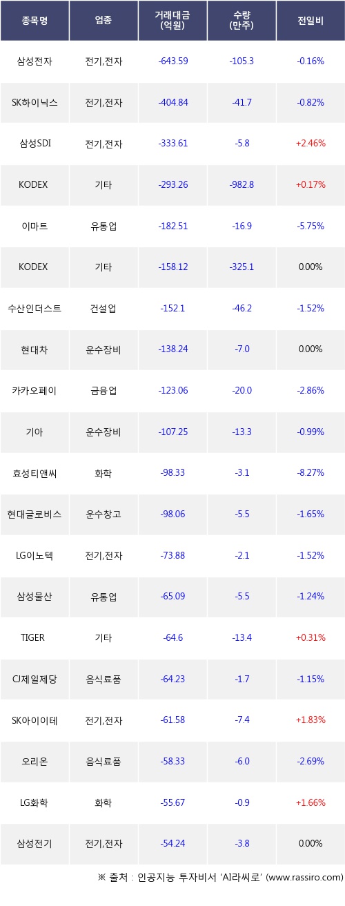 기관 투자자의 순매도 상위 20개 종목은 삼성전자, SK하이닉스, 삼성SDI, KODEX 200선물인버스2X, 이마트, KODEX 코스닥150선물인버스, 수산인더스트리, 현대차, 카카오페이, 기아등이다.