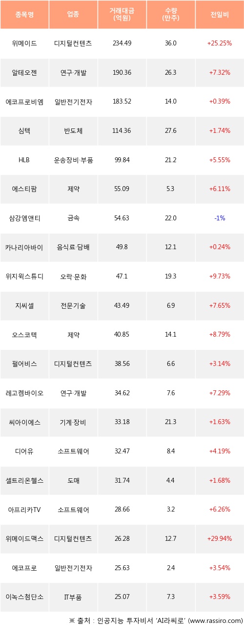 외국인 투자자의 순매수 상위 20개 종목은 위메이드, 알테오젠, 에코프로비엠, 심텍, HLB, 에스티팜, 삼강엠앤티, 카나리아바이오, 위지윅스튜디오, 지씨셀등이다.