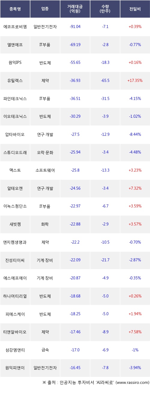 기관 투자자의 순매도 상위 20개 종목은 에코프로비엠, 엘앤에프, 원익IPS, 유틸렉스, 파인테크닉스, 이오테크닉스, 압타바이오, 스튜디오드래곤, 맥스트, 알테오젠등이다.