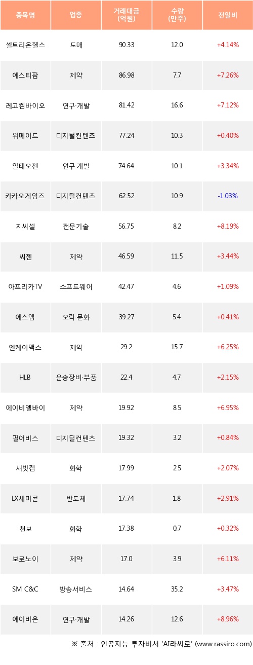 기관 투자자의 순매수 상위 20개 종목은 셀트리온헬스케어, 에스티팜, 레고켐바이오, 위메이드, 알테오젠, 카카오게임즈, 지씨셀, 씨젠, 아프리카TV, 에스엠등이다.