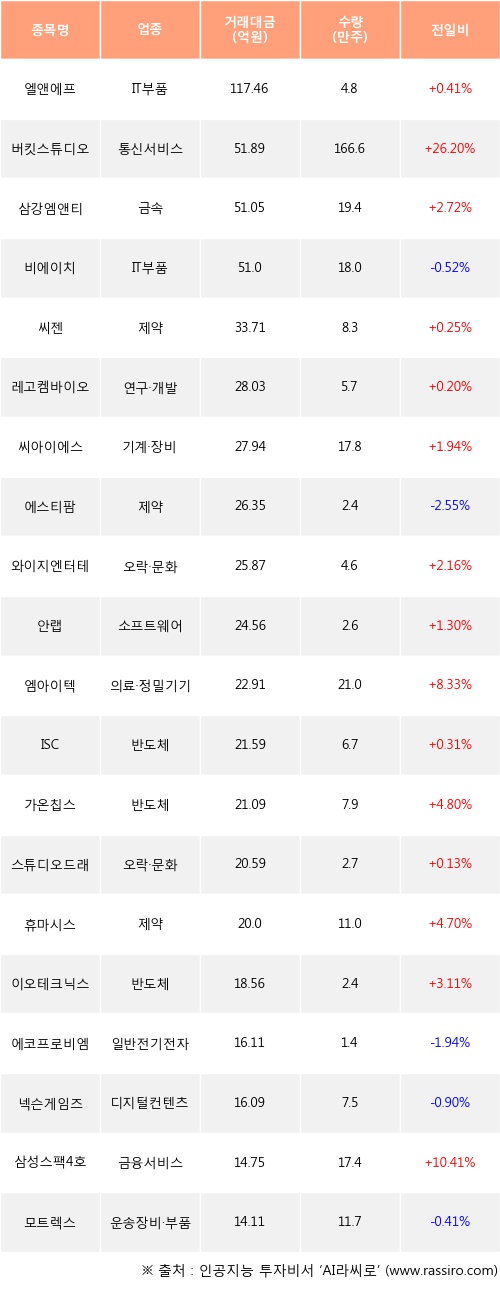 엘앤에프, 버킷스튜디오, 삼강엠앤티 등은 전일 대비 주가가 상승했고, 비에이치, 에스티팜, 에코프로비엠 등은 주가가 하락했다.