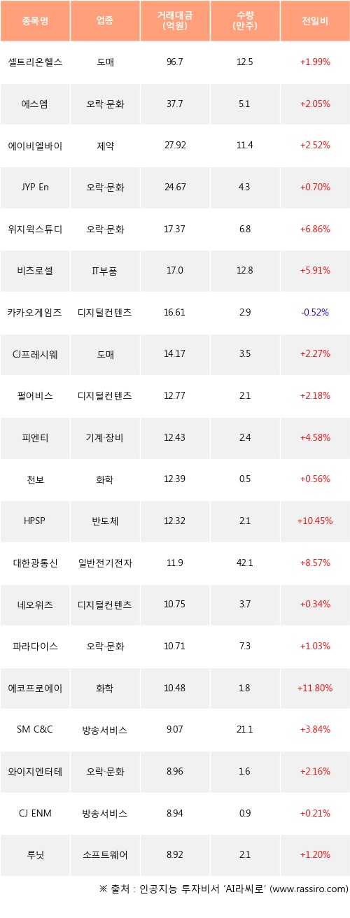 기관 투자자의 순매수 상위 20개 종목은 셀트리온헬스케어, 에스엠, 에이비엘바이오, JYP Ent., 위지윅스튜디오, 비츠로셀, 카카오게임즈, CJ프레시웨이, 펄어비스, 피엔티등이다.