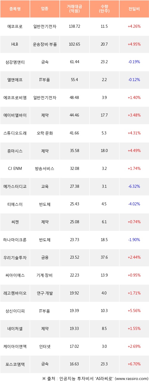 에코프로, HLB, 에코프로비엠 등은 전일 대비 주가가 상승했고, 삼강엠앤티, 엘앤에프, 메가스터디교육 등은 주가가 하락했다.