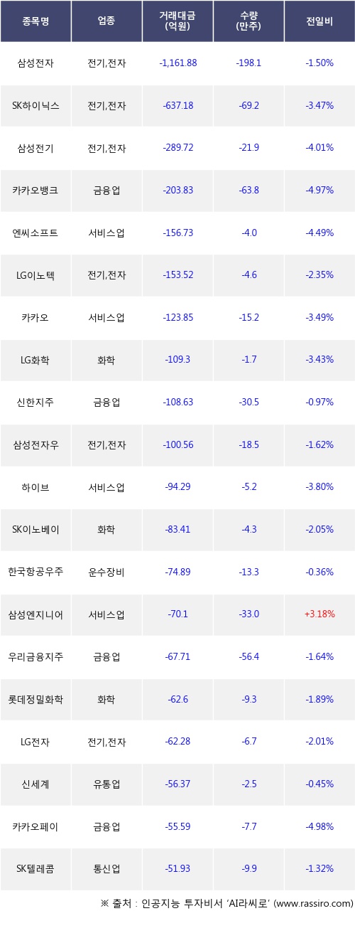 외국인 투자자의 순매도 상위 20개 종목은 삼성전자, SK하이닉스, 삼성전기, 카카오뱅크, 엔씨소프트, LG이노텍, 카카오, LG화학, 신한지주, 삼성전자우등이다.