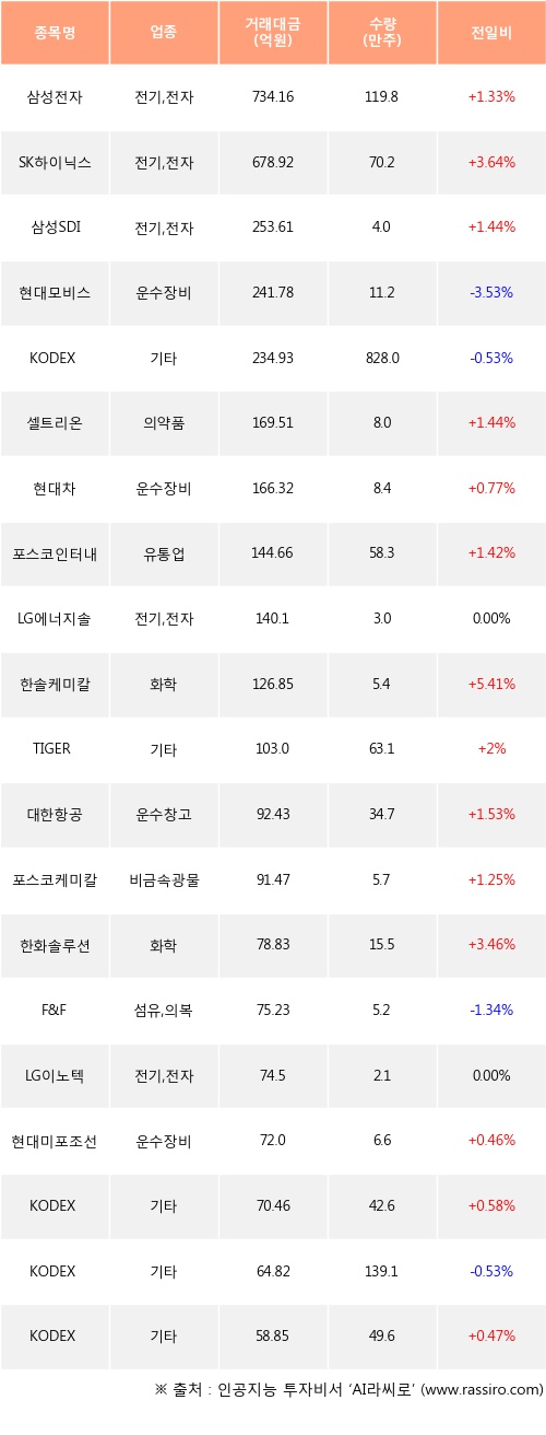 삼성전자, SK하이닉스, 삼성SDI 등은 전일 대비 주가가 상승했고, 현대모비스, KODEX 200선물인버스2X, F&F 등은 주가가 하락했다.