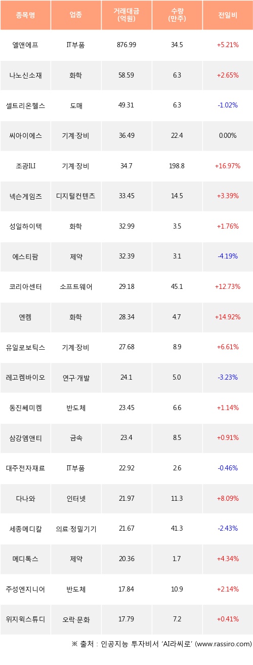 엘앤에프, 나노신소재, 조광ILI 등은 전일 대비 주가가 상승했고, 셀트리온헬스케어, 에스티팜, 레고켐바이오 등은 주가가 하락했다.