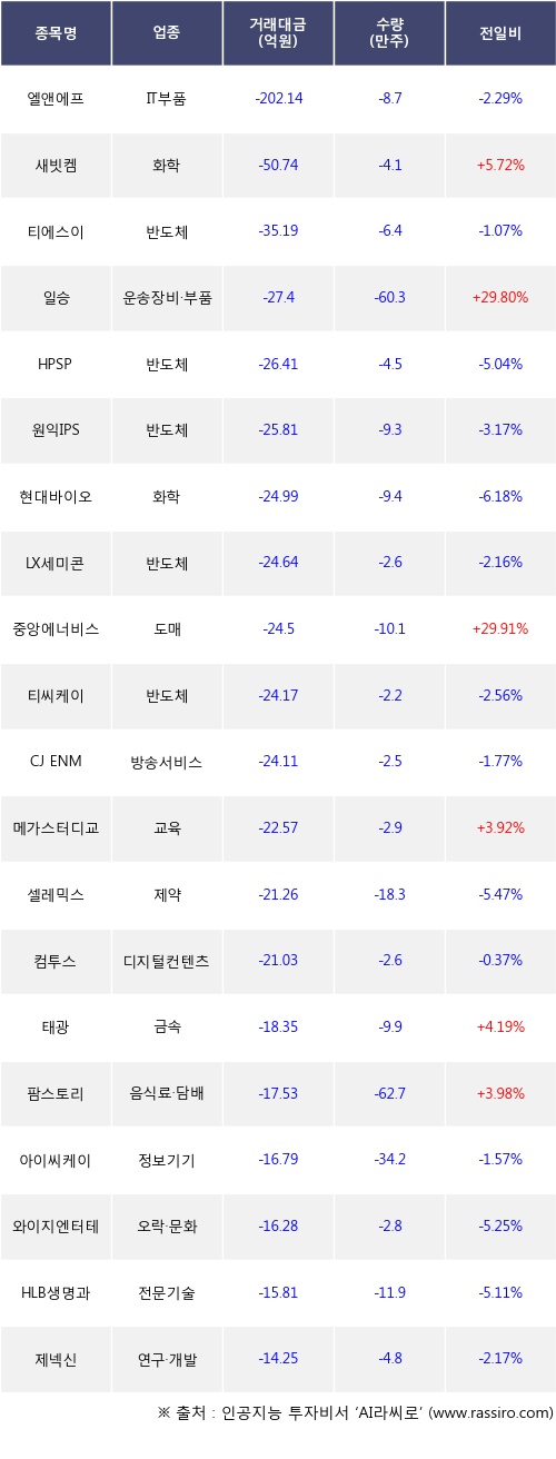 외국인 투자자의 순매도 상위 20개 종목은 엘앤에프, 새빗켐, 티에스이, 일승, HPSP, 원익IPS, 현대바이오, LX세미콘, 중앙에너비스, 티씨케이등이다.