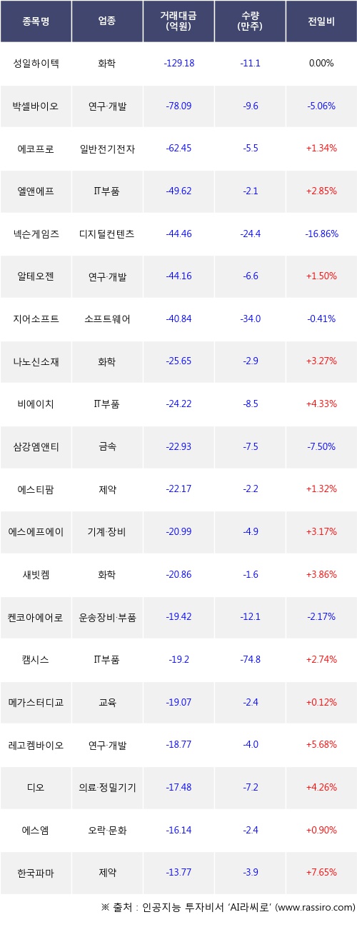 외국인 투자자의 순매도 상위 20개 종목은 성일하이텍, 박셀바이오, 에코프로, 엘앤에프, 넥슨게임즈, 알테오젠, 지어소프트, 나노신소재, 비에이치, 삼강엠앤티등이다.