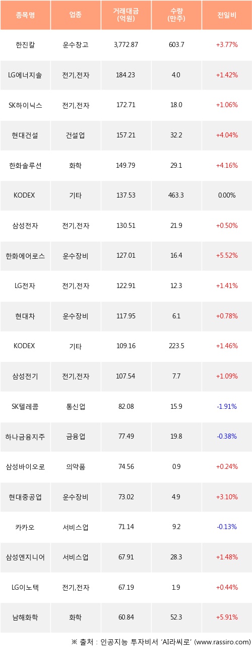 한진칼, LG에너지솔루션, SK하이닉스 등은 전일 대비 주가가 상승했고, SK텔레콤, 하나금융지주, 카카오 등은 주가가 하락했다.