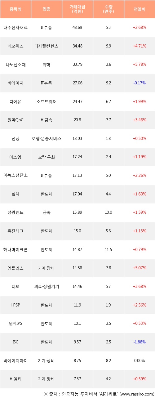 기관 투자자의 순매수 상위 20개 종목은 대주전자재료, 네오위즈, 나노신소재, 비에이치, 디어유, 원익QnC, 선광, 에스엠, 이녹스첨단소재, 심텍등이다.