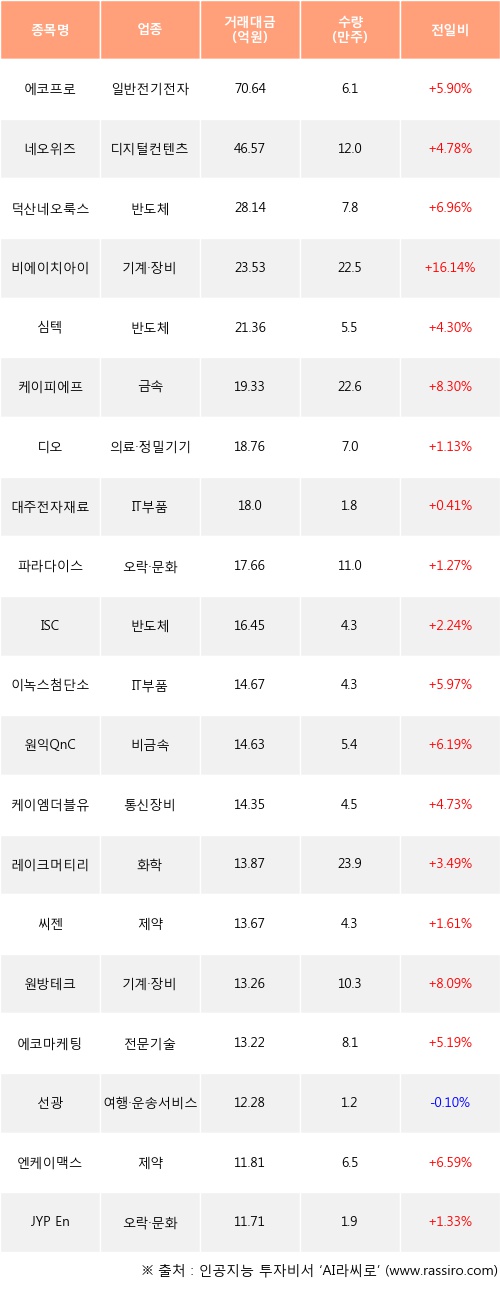 기관 투자자의 순매수 상위 20개 종목은 에코프로, 네오위즈, 덕산네오룩스, 비에이치아이, 심텍, 케이피에프, 디오, 대주전자재료, 파라다이스, ISC등이다.