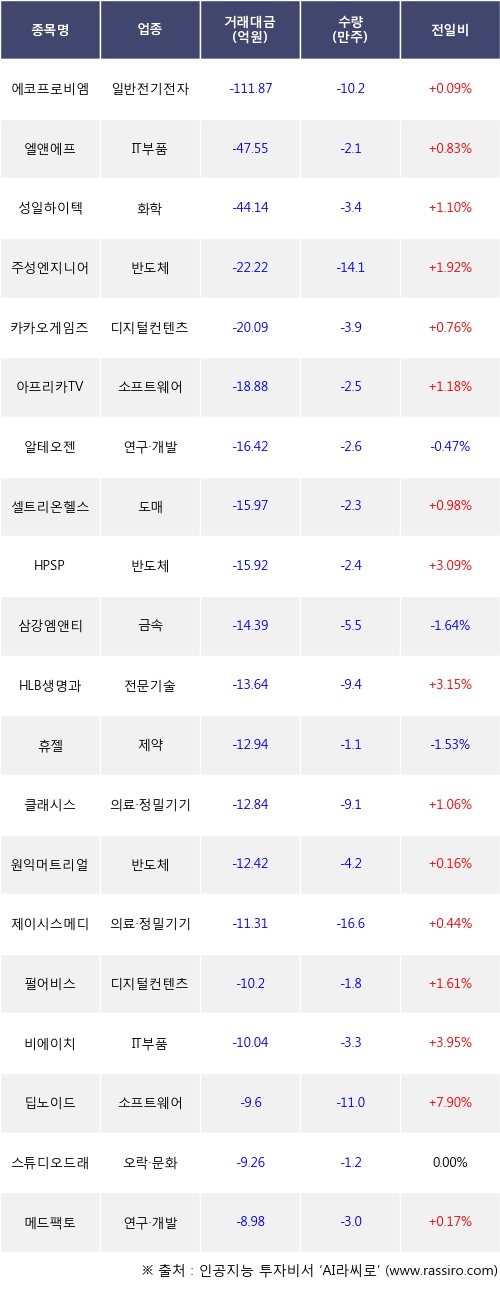 기관 투자자의 순매도 상위 20개 종목은 에코프로비엠, 엘앤에프, 성일하이텍, 주성엔지니어링, 카카오게임즈, 아프리카TV, 알테오젠, 셀트리온헬스케어, HPSP, 삼강엠앤티등이다.