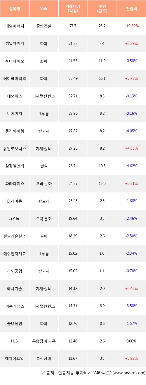 외국인 투자자의 순매수 상위 20개 종목은 대명에너지, 성일하이텍, 현대바이오, 레이크머티리얼즈, 네오위즈, 비에이치, 동진쎄미켐, 유일로보틱스, 삼강엠앤티, 파라다이스등이다.