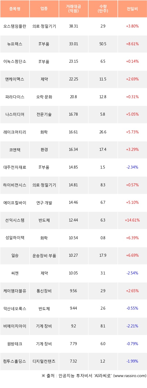 기관 투자자의 순매수 상위 20개 종목은 오스템임플란트, 뉴프렉스, 이녹스첨단소재, 엔케이맥스, 파라다이스, 나스미디어, 레이크머티리얼즈, 코엔텍, 대주전자재료, 하이비젼시스템등이다.