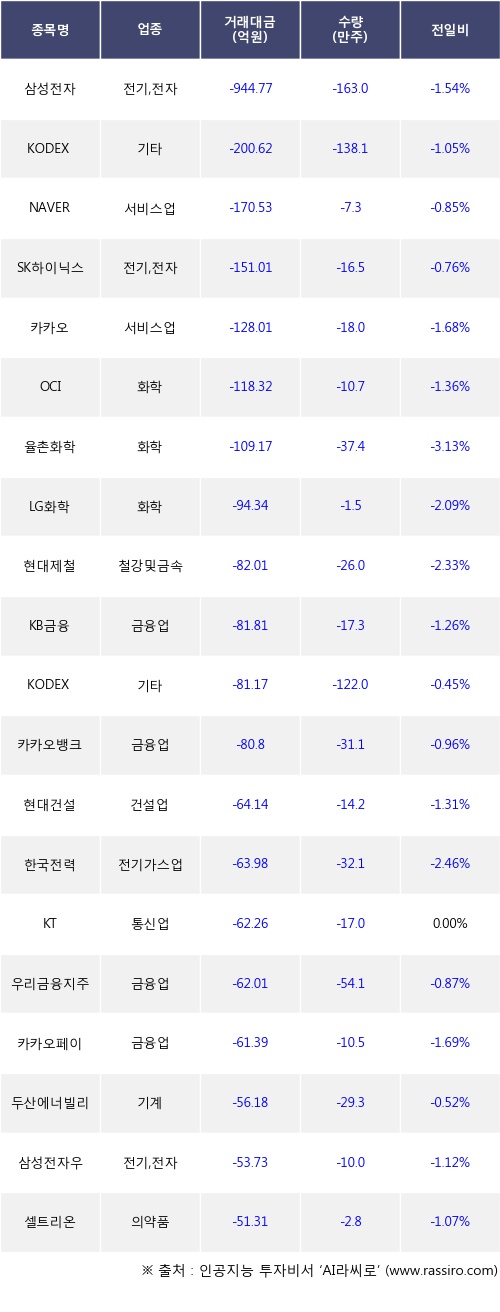 기관 투자자의 순매도 상위 20개 종목은 삼성전자, KODEX 레버리지, NAVER, SK하이닉스, 카카오, OCI, 율촌화학, LG화학, 현대제철, KB금융등이다.