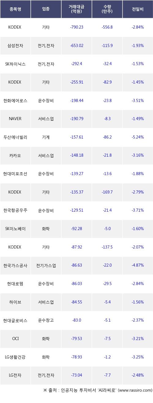이날 기관 투자자가 순매도한 종목들 중에 KODEX 레버리지, 삼성전자, SK하이닉스 등은 전일 대비 주가가 하락했다.