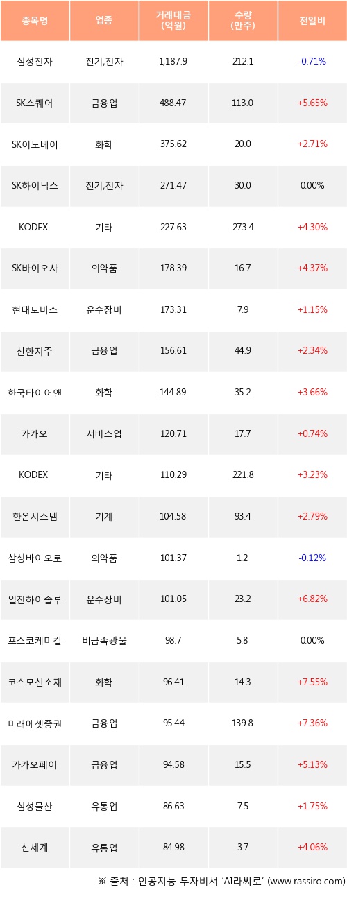 SK스퀘어, SK이노베이션, KODEX 코스닥150레버리지 등은 전일 대비 주가가 상승했고, 삼성전자, 삼성바이오로직스 등은 주가가 하락했다.