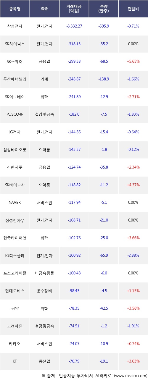 외국인 투자자의 순매도 상위 20개 종목은 삼성전자, SK하이닉스, SK스퀘어, 두산에너빌리티, SK이노베이션, POSCO홀딩스, LG전자, 삼성바이오로직스, 신한지주, SK바이오사이언스등이다.