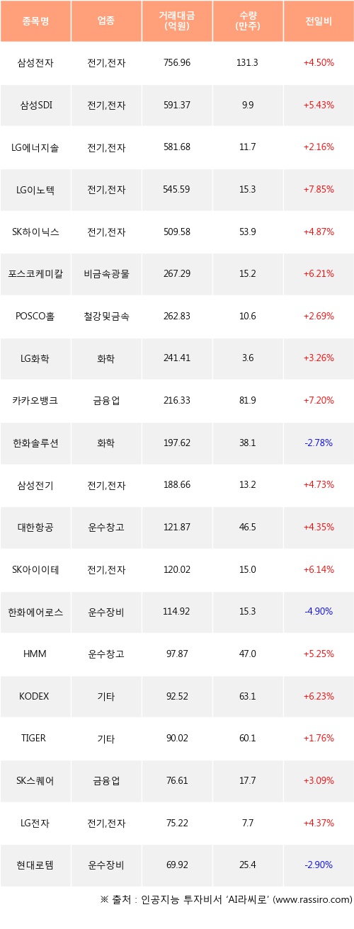삼성전자, 삼성SDI, LG에너지솔루션 등은 전일 대비 주가가 상승했고, 한화솔루션, 한화에어로스페이스, 현대로템 등은 주가가 하락했다.