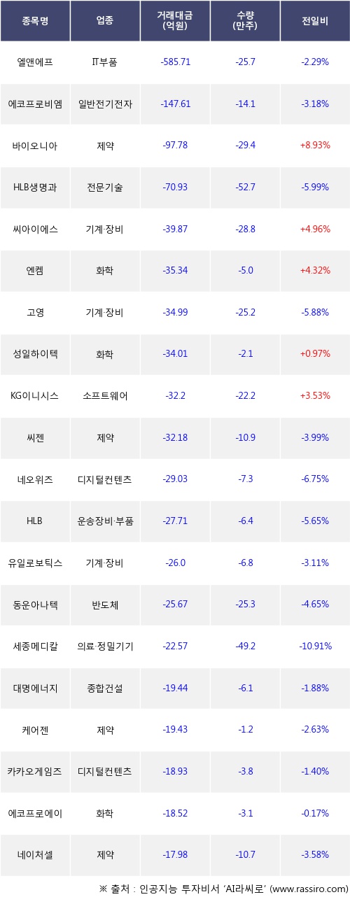 외국인 투자자의 순매도 상위 20개 종목은 엘앤에프, 에코프로비엠, 바이오니아, HLB생명과학, 씨아이에스, 엔켐, 고영, 성일하이텍, KG이니시스, 씨젠등이다.