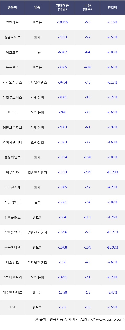 기관 투자자의 순매도 상위 20개 종목은 엘앤에프, 성일하이텍, 에코프로, 뉴프렉스, 카카오게임즈, 유일로보틱스, JYP Ent., 레인보우로보틱스, 와이지엔터테인먼트, 동성화인텍등이다.