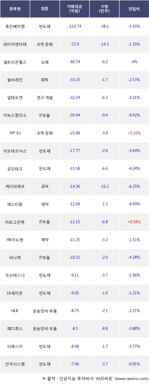 기관 투자자의 순매도 상위 20개 종목은 동진쎄미켐, 와이지엔터테인먼트, 셀트리온헬스케어, 솔브레인, 알테오젠, 이녹스첨단소재, JYP Ent., 이오테크닉스, 유진테크, 케이피에프등이다.