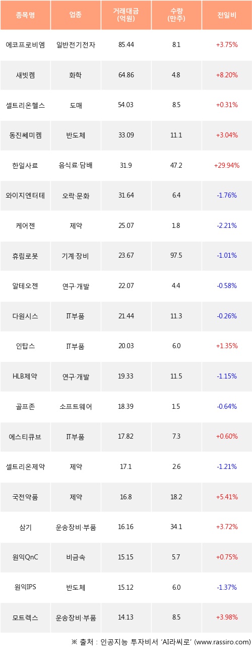 외국인 투자자의 순매수 상위 20개 종목은 에코프로비엠, 새빗켐, 셀트리온헬스케어, 동진쎄미켐, 한일사료, 와이지엔터테인먼트, 케어젠, 휴림로봇, 알테오젠, 다원시스등이다.