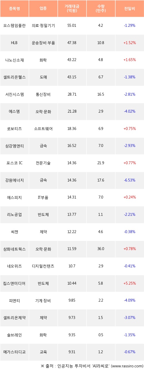 HLB, 나노신소재, 로보티즈 등은 전일 대비 주가가 상승했고, 오스템임플란트, 셀트리온헬스케어, 서진시스템 등은 주가가 하락했다.