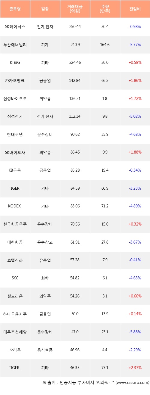 KT&G, 카카오뱅크, 삼성바이오로직스 등은 전일 대비 주가가 상승했고, SK하이닉스, 두산에너빌리티, 삼성전기 등은 주가가 하락했다.