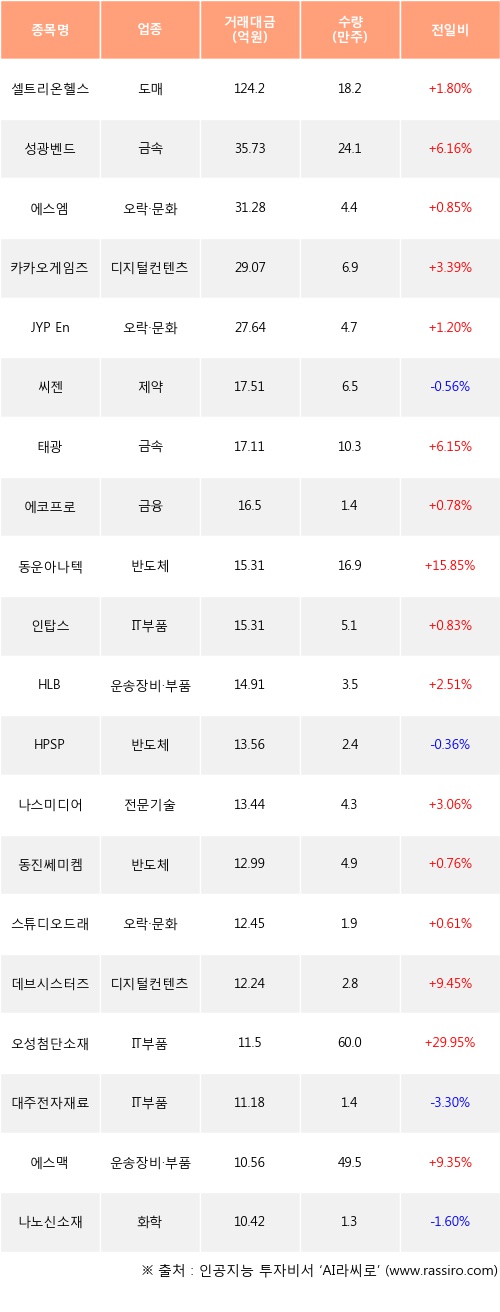 셀트리온헬스케어, 성광벤드, 에스엠 등은 전일 대비 주가가 상승했고, 씨젠, HPSP, 대주전자재료 등은 주가가 하락했다.