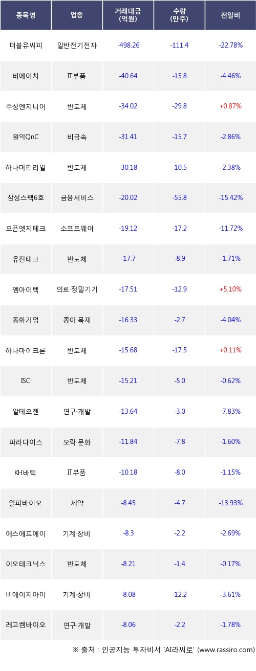 기관 투자자의 순매도 상위 20개 종목은 더블유씨피, 비에이치, 주성엔지니어링, 원익QnC, 하나머티리얼즈, 삼성스팩6호, 오픈엣지테크놀로지, 유진테크, 엠아이텍, 동화기업등이다.