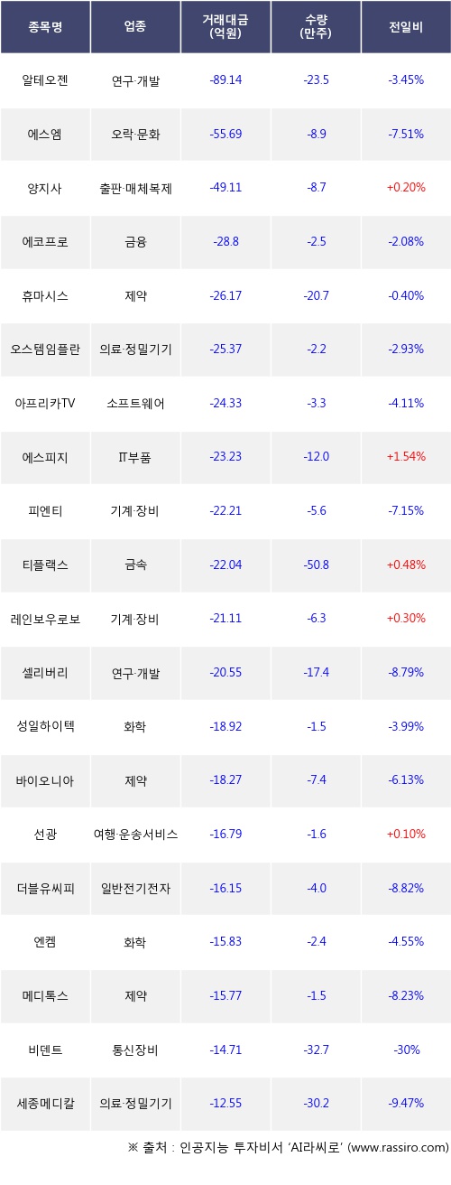 외국인 투자자의 순매도 상위 20개 종목은 알테오젠, 에스엠, 양지사, 에코프로, 휴마시스, 오스템임플란트, 아프리카TV, 에스피지, 피엔티, 티플랙스등이다.
