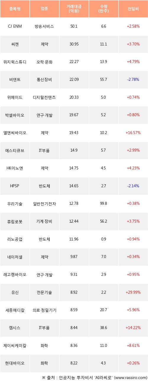 CJ ENM, 씨젠, 위지윅스튜디오 등은 전일 대비 주가가 상승했고, 비덴트, HPSP 등은 주가가 하락했다.