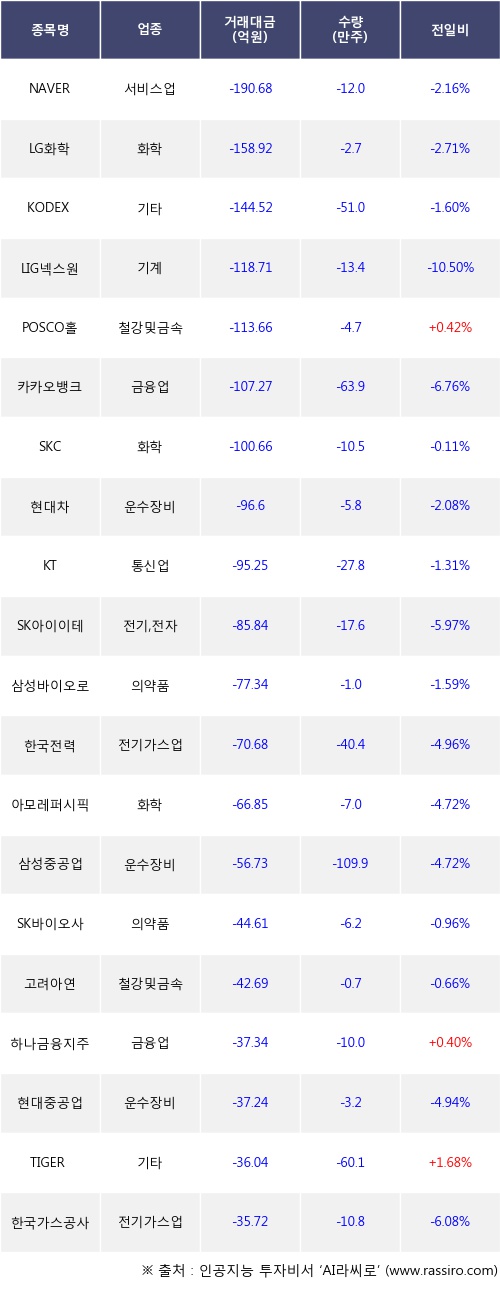 외국인 투자자의 순매도 상위 20개 종목은 NAVER, LG화학, KODEX 200, LIG넥스원, POSCO홀딩스, 카카오뱅크, SKC, 현대차, KT, SK아이이테크놀로지등이다.