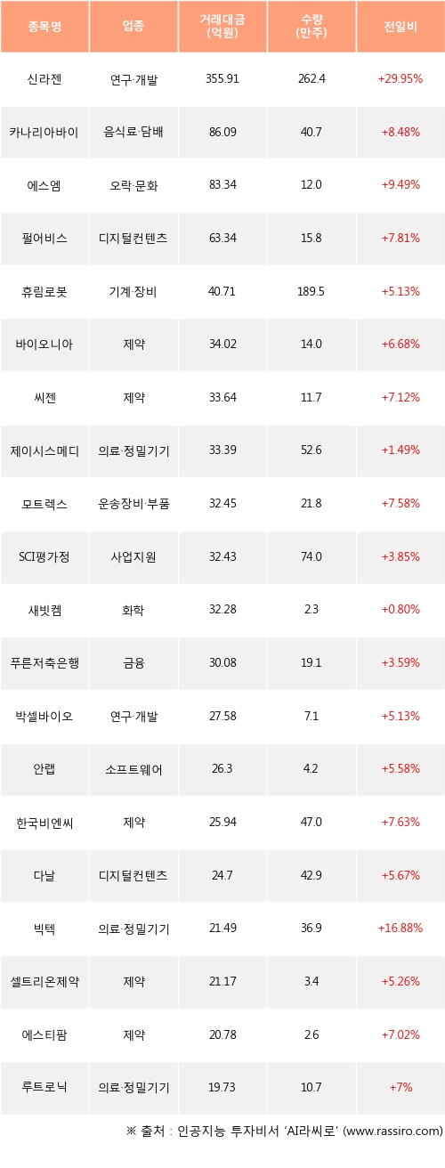 외국인 투자자의 순매수 상위 20개 종목은 신라젠, 카나리아바이오, 에스엠, 펄어비스, 휴림로봇, 바이오니아, 씨젠, 제이시스메디칼, 모트렉스, SCI평가정보등이다.