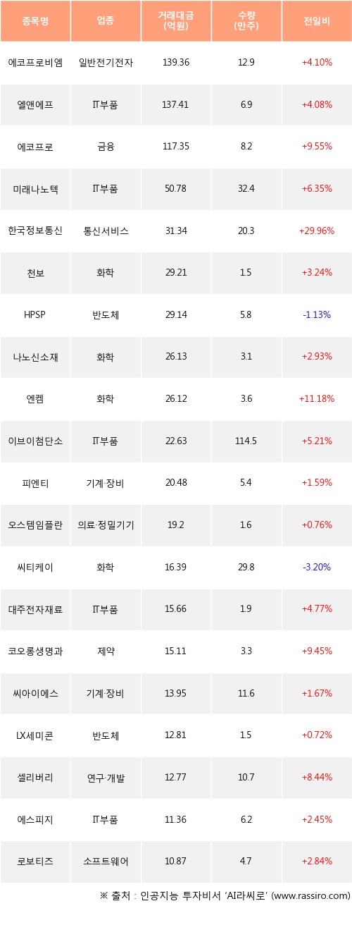 외국인 투자자의 순매수 상위 20개 종목은 에코프로비엠, 엘앤에프, 에코프로, 미래나노텍, 한국정보통신, 천보, HPSP, 나노신소재, 엔켐, 이브이첨단소재등이다.