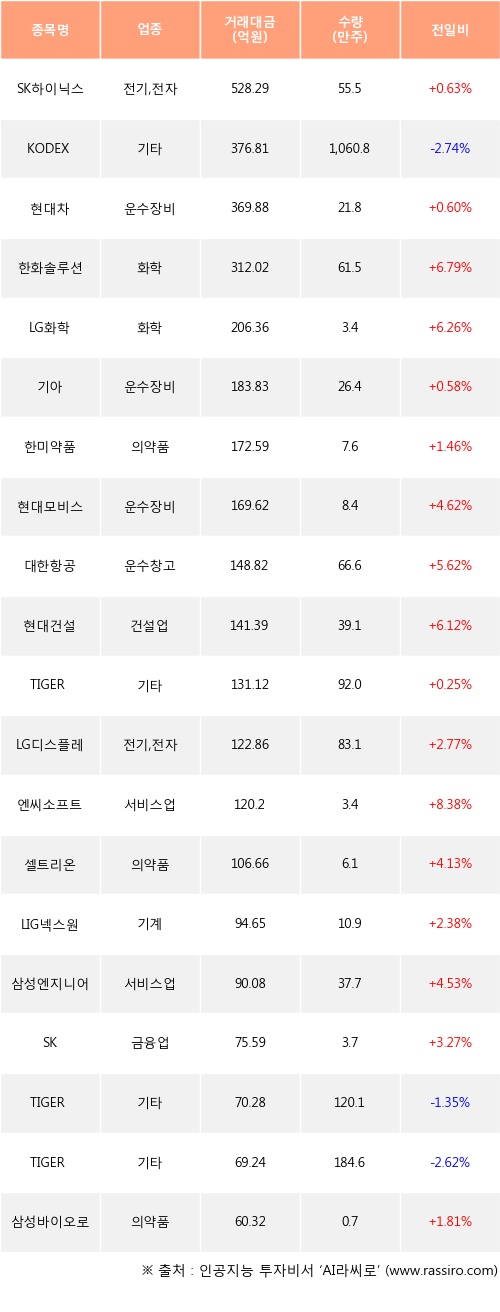 SK하이닉스, 현대차, 한화솔루션 등은 전일 대비 주가가 상승했고, KODEX 200선물인버스2X, TIGER 인버스, TIGER 200선물인버스2X 등은 주가가 하락했다.