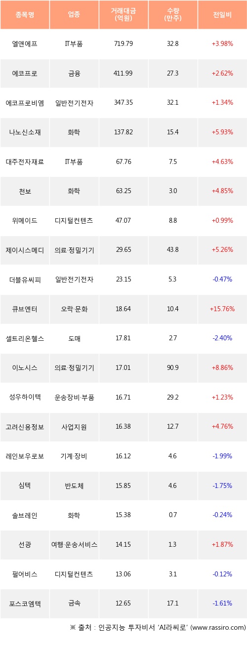 엘앤에프, 에코프로, 에코프로비엠 등은 전일 대비 주가가 상승했고, 더블유씨피, 셀트리온헬스케어, 레인보우로보틱스 등은 주가가 하락했다.