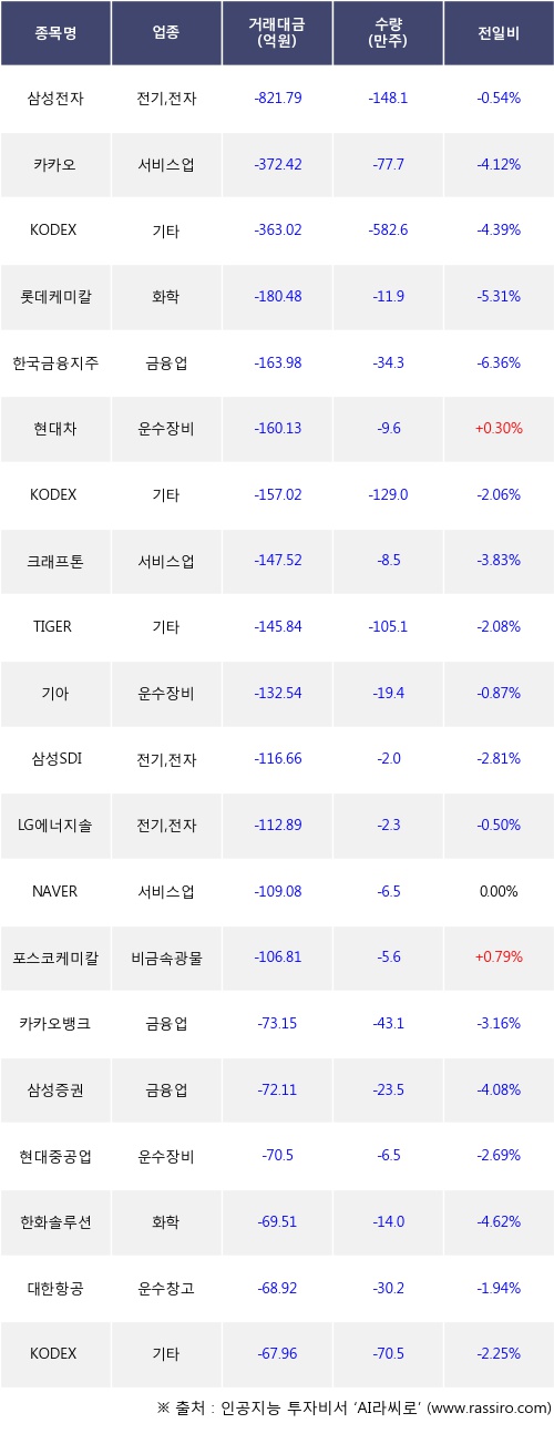기관 투자자의 순매도 상위 20개 종목은 삼성전자, 카카오, KODEX 코스닥150레버리지, 롯데케미칼, 한국금융지주, 현대차, KODEX 레버리지, 크래프톤, TIGER 차이나전기차SOLACTIVE, 기아등이다.