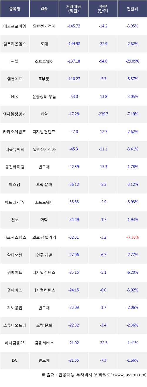 기관 투자자의 순매도 상위 20개 종목은 에코프로비엠, 셀트리온헬스케어, 핀텔, 엘앤에프, HLB, 엔지켐생명과학, 카카오게임즈, 더블유씨피, 동진쎄미켐, 에스엠등이다.