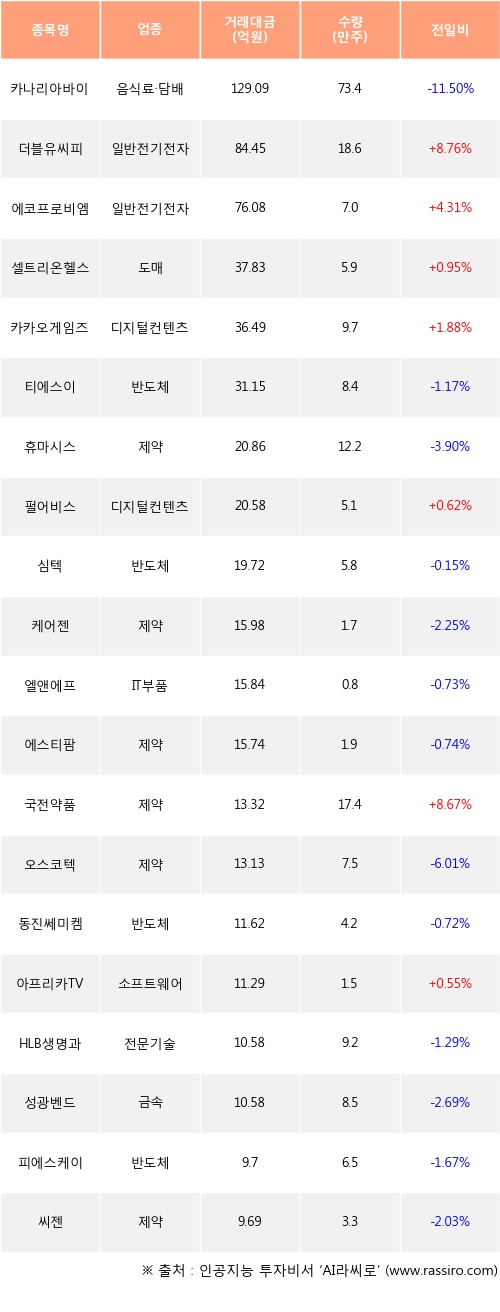 외국인 투자자의 순매수 상위 20개 종목은 카나리아바이오, 더블유씨피, 에코프로비엠, 셀트리온헬스케어, 카카오게임즈, 티에스이, 휴마시스, 펄어비스, 심텍, 케어젠등이다.