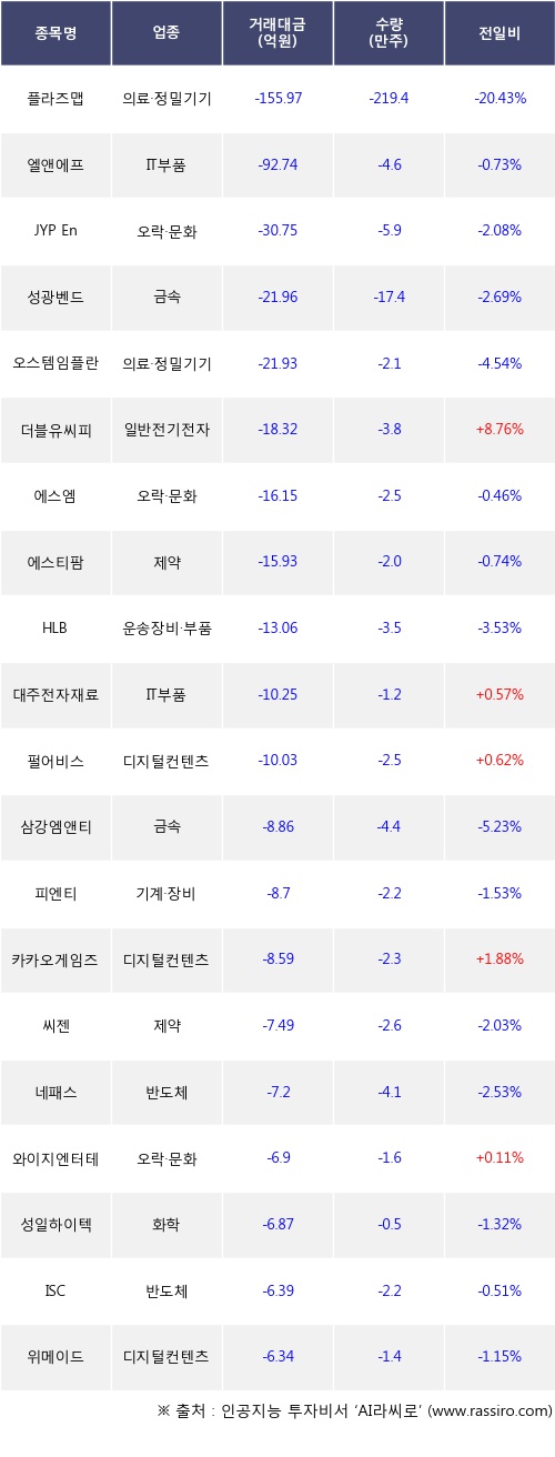 기관 투자자의 순매도 상위 20개 종목은 플라즈맵, 엘앤에프, JYP Ent., 성광벤드, 오스템임플란트, 더블유씨피, 에스엠, 에스티팜, HLB, 대주전자재료등이다.