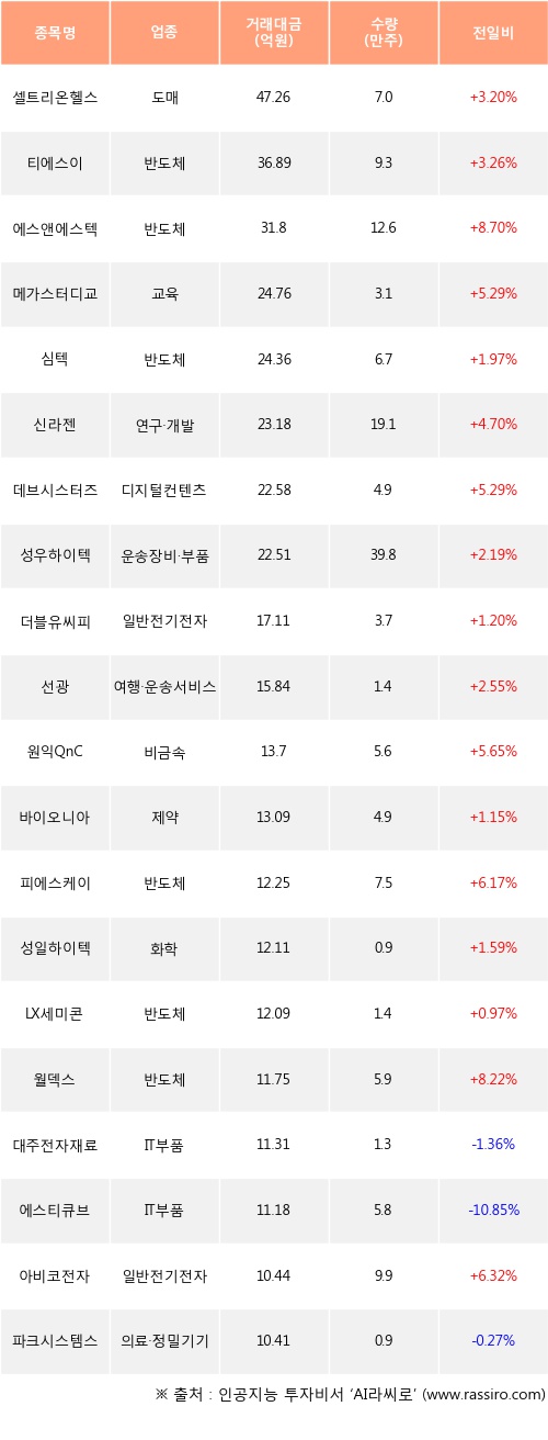 외국인 투자자의 순매수 상위 20개 종목은 셀트리온헬스케어, 티에스이, 에스앤에스텍, 메가스터디교육, 심텍, 신라젠, 데브시스터즈, 성우하이텍, 더블유씨피, 선광등이다.