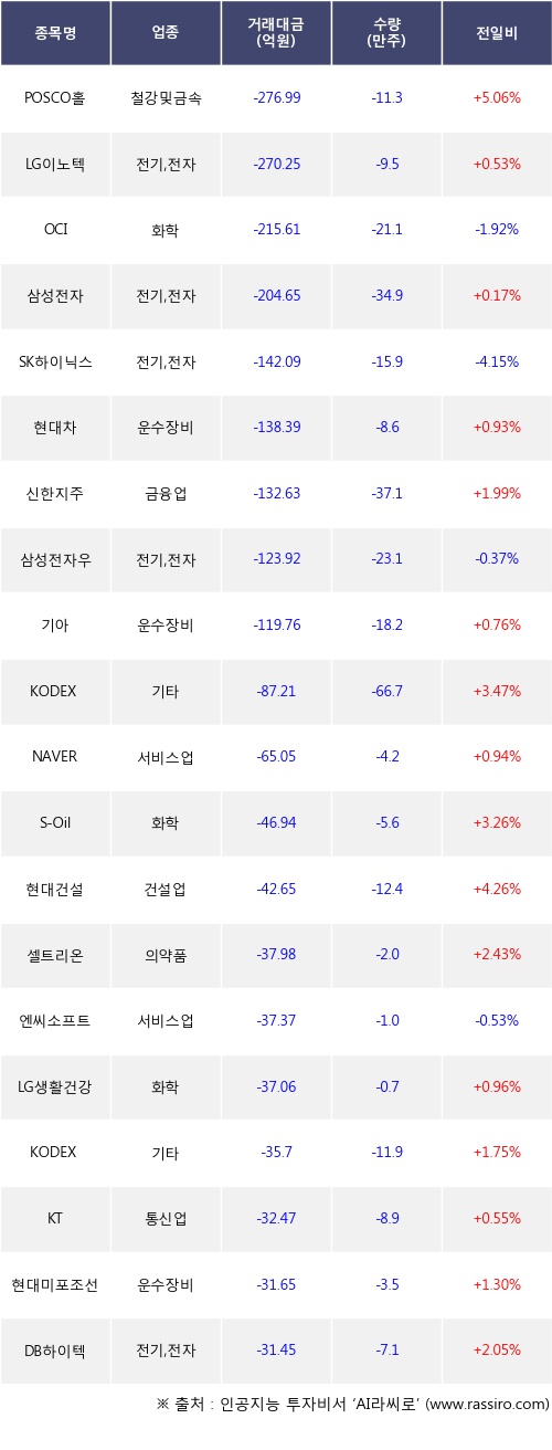 외국인 투자자의 순매도 상위 20개 종목은 POSCO홀딩스, LG이노텍, OCI, 삼성전자, SK하이닉스, 현대차, 신한지주, 삼성전자우, 기아, KODEX 레버리지등이다.