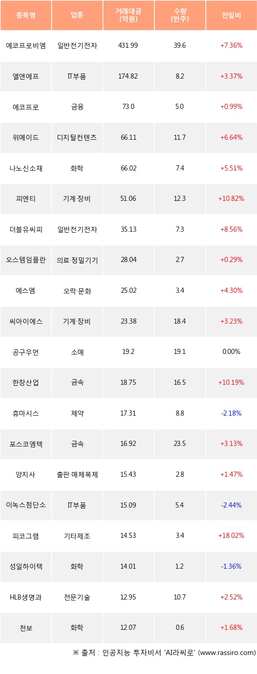 외국인 투자자의 순매수 상위 20개 종목은 에코프로비엠, 엘앤에프, 에코프로, 위메이드, 나노신소재, 피엔티, 더블유씨피, 오스템임플란트, 에스엠, 씨아이에스등이다.