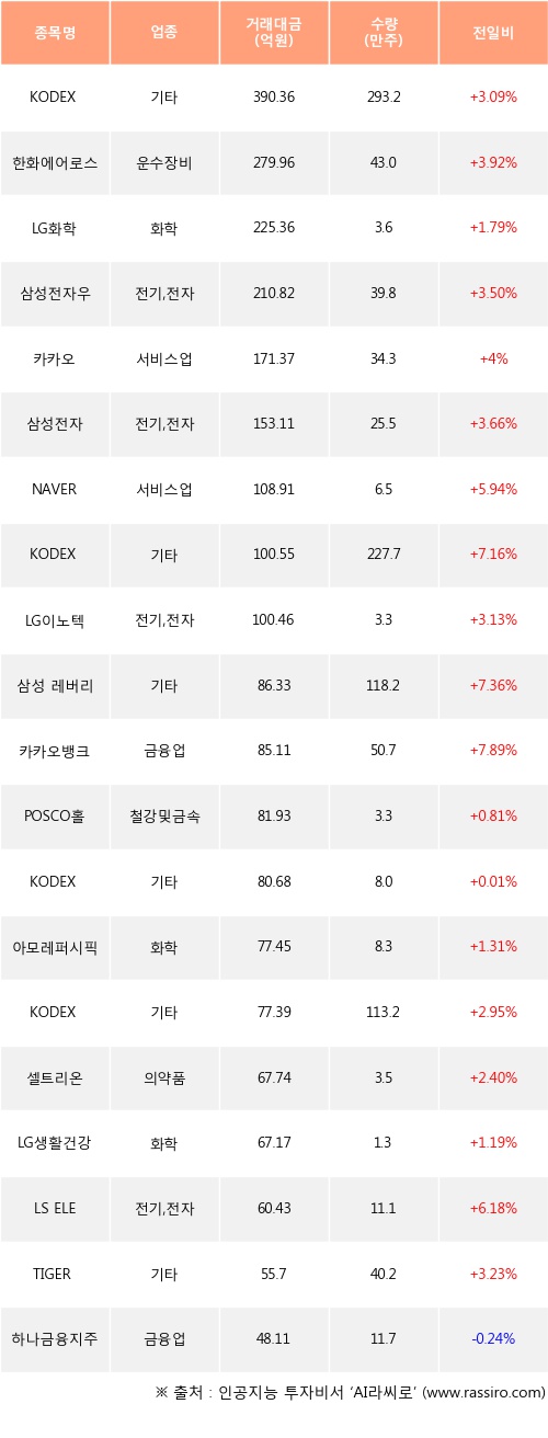 KODEX 레버리지, 한화에어로스페이스, LG화학 등은 전일 대비 주가가 상승했고, 하나금융지주 등은 주가가 하락했다.