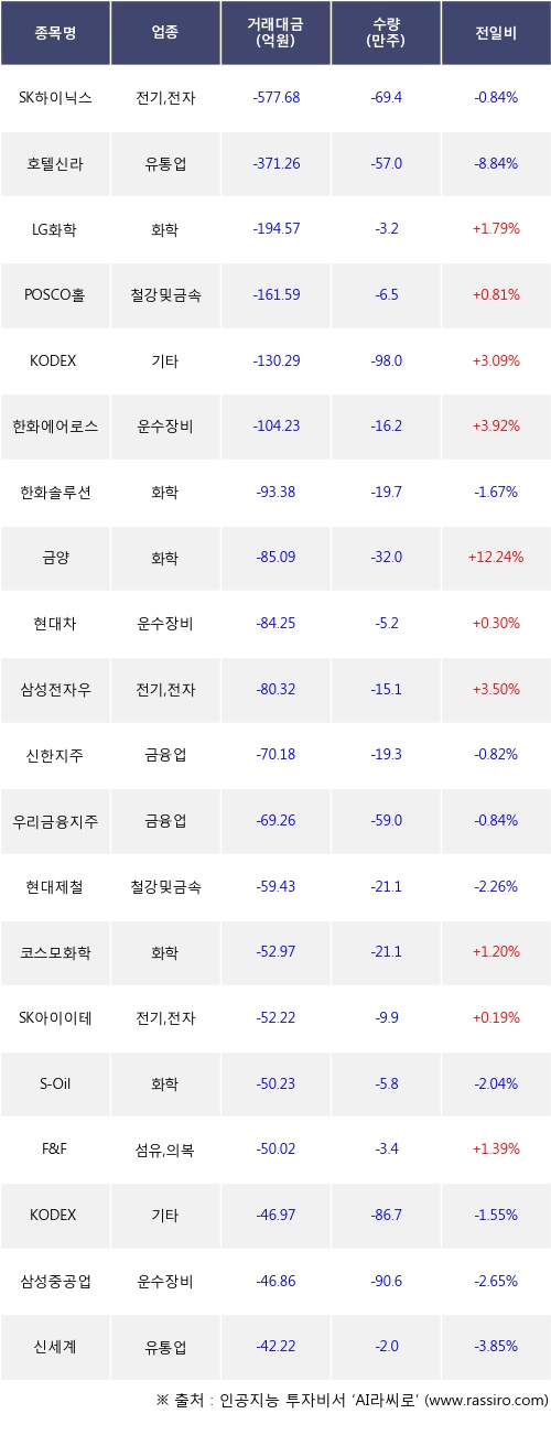 외국인 투자자의 순매도 상위 20개 종목은 SK하이닉스, 호텔신라, LG화학, POSCO홀딩스, KODEX 레버리지, 한화에어로스페이스, 한화솔루션, 금양, 현대차, 삼성전자우등이다.