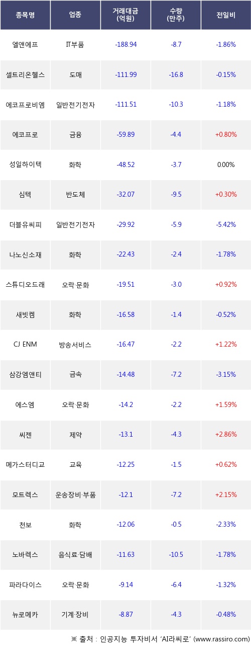 기관 투자자의 순매도 상위 20개 종목은 엘앤에프, 셀트리온헬스케어, 에코프로비엠, 에코프로, 성일하이텍, 심텍, 더블유씨피, 나노신소재, 스튜디오드래곤, 새빗켐등이다.